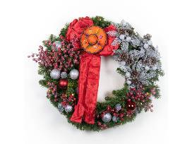 Included--Battery-operated, lighted 30" wreath with decorations and gift card:
