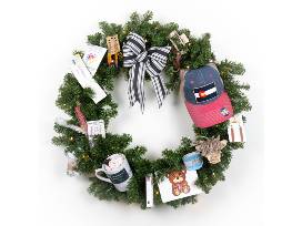 Included--Battery-operated, lighted 30" wreath with decorations and gift card: