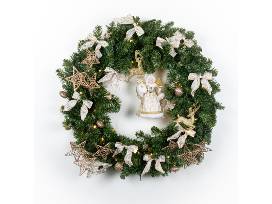 Included--Battery-operated, lighted 30" wreath with decorations and gift cards to: