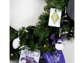 Included--Battery-operated, lighted 30" wreath with decorations and gift card: