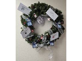 Included--Battery-operated, lighted 30" wreath with decorations, gifts and gift cards: