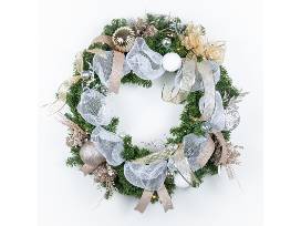 Included--Battery-operated, lighted 30" wreath with decorations and gifts:
