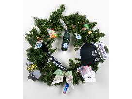 Included--Battery-operated, lighted 30" wreath with decorations and gifts:
