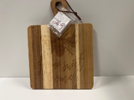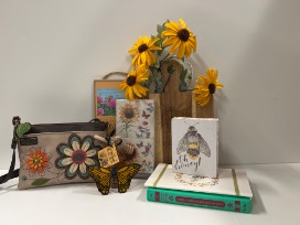 Includes "The Secret Life of Bees" book, CHALA Crossbody clutch, charcuterie board, 4 stone coasters, honey & dipper, bee notebook, bee wall plaque, hand-crafted stained glass buttery, sunflower tote.