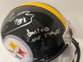 Full size Steelers helmet signed by Alejandro Villanueva. Villanueva was a West Point grad drafted by the Steelers. If you remember the game when the team did not come out of the locker for singing of National Anthem, Captain Villanueva came out alone for the National Anthem.