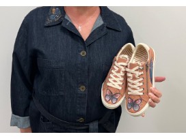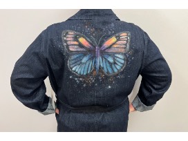 Denim jacket (XL) w/ hand painted butterfly theme, with painted Taos shoe 8 1/2; gift certificate for future small window painting.