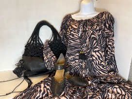 River + Sky Zebra - Haven Dress (size Large), Daniella Lehavi black crochet tote bag, Rieker Mirjam pump - black, size 39 (8 - 8.5 US size, exchangeable for different size while supplies last or until 10/15/2023), and a $25 Plum Bottom gift certificate. Other items are not returnable or exchangeable.
