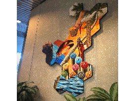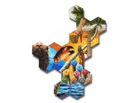 A celebration of Floridian arts, culture and lifestyle! The cluster of 1/2"-deep gallery-wrap hexagonal canvases are attached by hardware in the back, and supported by a wooden structure with hanging hardware. The piece is unframed with black painted sides, and protected by an isolation coat and top coat of UV varnish.