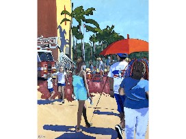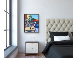 I paint in oil or acrylic on pre-stretched canvas. My paintings use a vibrant, bright color composition with strong shapes, line work and some elements of perspective. They have a narrative, illustrative style that often has an expressionistic slant.