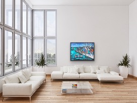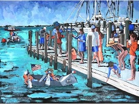 I paint in oil or acrylic on pre-stretched canvas. My paintings use a vibrant, bright color composition with strong shapes, line work and some elements of perspective. They have a narrative, illustrative style that often has an expressionistic slant.