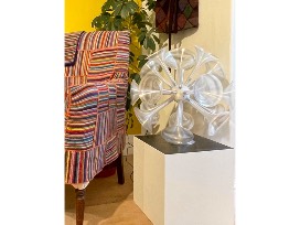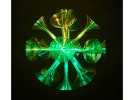 Originally created using metal and fibreglass, the sculptures have been recreated in a variety of materials, including paper. This has ultimately resulted in the signature geometric form of the one-million-times-magnified 'discosphaera' sculpture, as a colour-changing light sculpture.