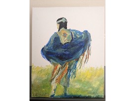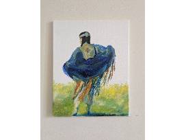 Additional Information: I spent my college years in Oklahoma, and had the chance to attend the Comanche Nation Fair in Lawton, Oklahoma around 2017. (Note: I am not an Indigenous American.) There were many performers competing in a wide range of Indigenous dance competitions, including the women's Fancy Shawl Dance depicted here. This painting captures a brief moment of rest amid an otherwise vigorous and highly athletic performance, a pause wherein the long fringe of the dancer's shawl continues to dazzle with its rippling, polychromatic motion.