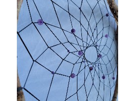 The hoop has been created with branches from a North Western Cedar that is located on my homestead. The branch was hand harvested in 2022. The inside is webbed and created with artificial sinew. The webbing is done after the hoop is dried for at least a one-year time frame. Black sinew is webbed inside this hoop and is laced with amethyst color beads and Amethyst crystals.