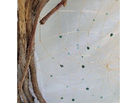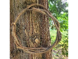 The hoop has been created with branches from a North Western Cedar that is located on my homestead. The branch was hand harvested in 2022. The inside is webbed and created with artificial sinew. The webbing is done after the hoop is dried for at least a one-year time frame. Natural color sinew webs the inside and is laced with Turquoise. Turquoise is a stone that is used to ground oneself and is for those whom crave joy and wisdom.