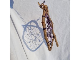 The hoop has been created with branches from a North Western Cedar that is located on my homestead. The branch was hand harvested in 2022. The inside is webbed and created with artificial sinew. The webbing is done after the hoop is dried for at least a one-year time frame. dark natural sinew is webbed inside his hoop and is laced with amethyst color beads and Amethyst crystals.