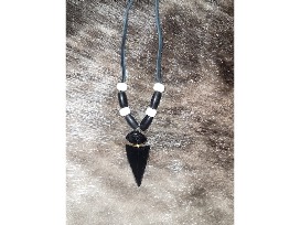 Medium: Hairpipe bone, Obsidian, Leather Cord, alloy