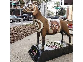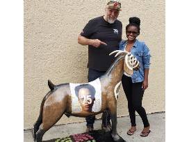 The GOAT is cast primarily out of Fortron, a material made to withstand the outdoors; however certain embellishments may do better in a protected environment. The goat is approximately 70 lbs, 60 inches long, 48" tall, and 23" wide.
