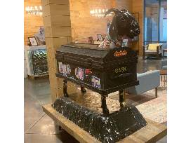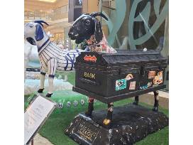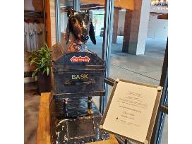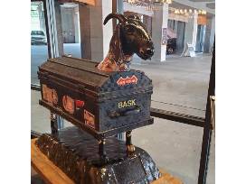 The GOAT is cast primarily out of Fortron, a material made to withstand the outdoors; however certain embellishments may do better in a protected environment. The goat is approximately 70 lbs, 60 inches long, 48" tall, and 23" wide.