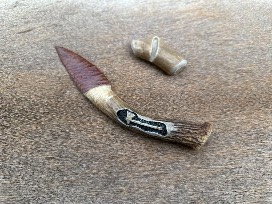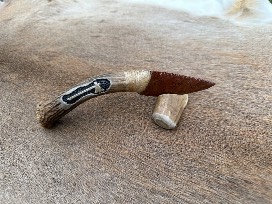 Medium: Real deer sinew tine, an obsidian blade, and a carved and stained tomahawk (war & peace) glyph.