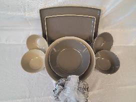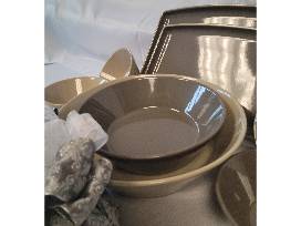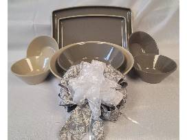 Serve it up in style at your next party with this collection that includes a Pampered Chef large serving platter, medium entertaining platter, medium serving bowl, large sandstone serving bowl, small sandstone serving bowl, and small greystone serving bowl.