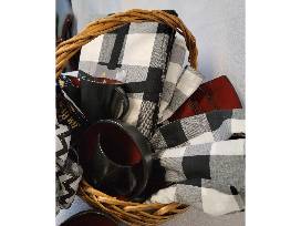 Set your table in style with this black place setting for four (plates, mugs, bowls), black and white tablecloth, napkins, and Jim Beam Bourbon Vanilla Coffee.