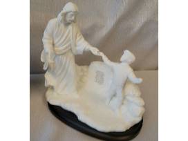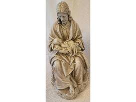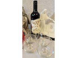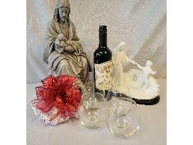 Delight in a bottle of Our Daily Red wine with four stemless wine glasses, a Lenox Irish Blessing statue, and an outdoor statue of Jesus holding a baby.