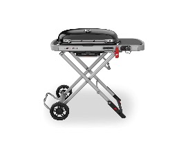 The Weber Traveler Black Grill is a portable propane grill with a durable cast-iron grate for great heat and flavor. Its 13,000 BTU burner heats up quickly and the push-button ignition makes grilling simple. Compact folding design fits in your trunk for easy transport, and the large cooking area lets you prepare a full meal anywhere using a 16.4 oz. LP cylinder (sold separately).