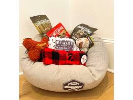 This bundle includes a comfy dog bed for man's best friend, along with treats and toys to keep your favorite pooch happy and entertained!