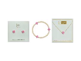 Gift set includes: (1) egirl Signature Cross Gold Pattern 3mm Bead Bracelet, (1) egirl 14" Necklace - Signature Cross, (1) Pair of Signature Cross Studs