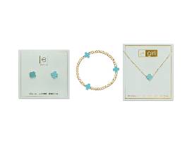Gift set includes: (1) egirl Signature Cross Gold Pattern 3mm Bead Bracelet, (1) egirl 14"" Necklace - Signature Cross, (1) Pair of Signature Cross Studs