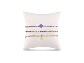 Bracelet stack of 3 includes: (1) egirl Hope Unwritten Bracelet - Purple People Eater, (1) egirl Hope Unwritten Signature Cross Bracelet - Purple People Eater - Purple, (1) egirl Classic Gold 2mm Bead Bracelet - Signature Cross Small Gold Charm