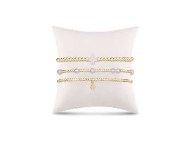 Bracelet stack of 3 includes: (1) egirl Hope Unwritten Bracelet - Pearl, (1) egirl Signature Cross Gold 3mm Bead Bracelet - Off-White, (1) egirl Classic Gold 2mm Bead Bracelet - Signature Cross Small Gold Charm