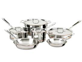 Sizzle, simmer, and saute to your heart's delight with these well-crafted, 10-piece set of five-ply bonded, copper core pots and pans from All-Clad. Their responsive five-ply design bonds stainless steel, aluminum, and a thick copper core for fast, even heating and warp-free strength.