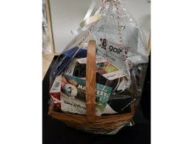 Gift basket includes pair of tickets to World of Golf at Disney Orlando, a set of practice range golf balls, a set of Hardwood golf tees, a Titleist hat, a $50 gift card to some restaurants, and some little goodies.