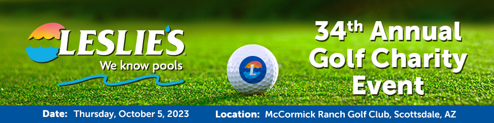 We invite you to the 34th Annual Leslie's Charity Golf Tournament on Thursday, October 5th at McCormick Ranch Golf Club in Scottsdale, Arizona. This invitation-only event is an 18-hole scramble format with breakfast beginning at 9 am and shotgun start beginning at 10:30 am.