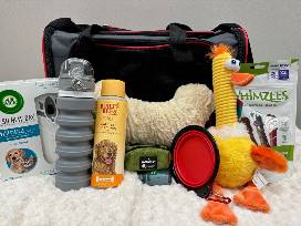 Take your little puppy on adventures with you! This set includes a dog carrier, soft bed, collapsable water bottle, collapsable water bowl, waste bags and waste bag carrier, two plush toys, Burts Bee's dog shampoo, dog treats, and an Air Wick pet odor neutralizer room spray.