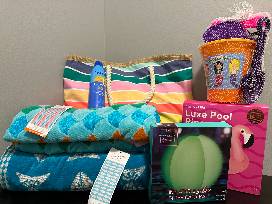 Get ready for the beach with this amazing summer fun package, including two beach towels, a beach bag, sunscreen, a pool ring, an inflatable glow-in-the-dark ball, and a beach pail and toys.