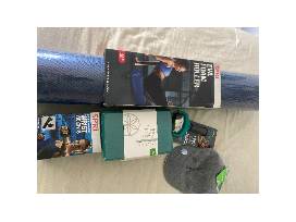 This package also includes a foam roller, a massage roller, a yoga block, two two-pound wrist weights, and a cute hat (great for covering "exercise hair").