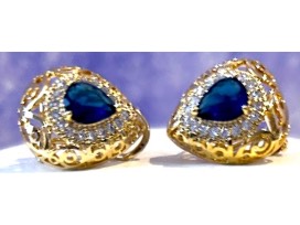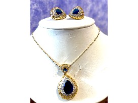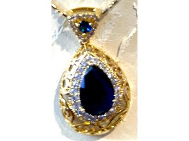 The pendant is two-toned filigree patterned. Pear-shaped sapphire blue crystal surrounded halo-style with clear crystals.