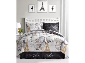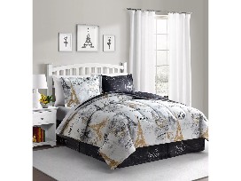 The enchanting city of Paris is the focal point on this 8-pc queen-size comforter set. The Eiffel Tower, local postmarks and the words "je t'aime" and "bonjour" cn be found.