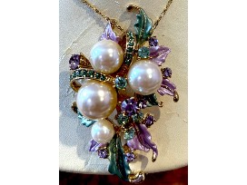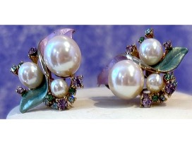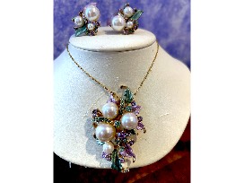 The pendant is removable and can be worn as a pin. The pearls are gorgeous - along with the enameled lavender and green petals. What a beautiful group! Matching earrings are pierced.