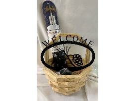 Wooden Planter Basket with wrought iron 'Welcome' sign, hooks and American flag.