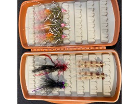 These flies were hand tied in Downtown Plano at Dirty Water Fly Company and are just perfect for the Texas coast. Includes three Coney Balognas, two Marsh Munchies and two Gotchas plus a Fishpond Tacky Pescador Fly Box.