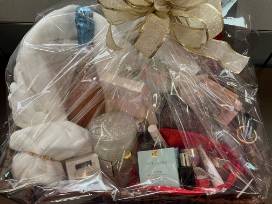 Luxury in a basket! Including a Nordstrom robe, Kate Spade bracelet, Voluspa candle, Patchology eye gels, Este Lauder Day Wear moisture cream and an array of samples, a bottle of Opaline Pino Noir Brut Rose, Bobby Brown face cream, Slip scrunchie, and wine glasses.