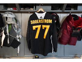 Pre-game worn ASU Night jersey in size 56. This jersey was worn during warmups of the Coyotes vs. Sharks game on April 1st, 2023 and autographed by #77 Victor Soderstrom.