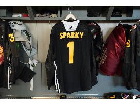 Pre-game worn ASU Night jersey in size 56. This jersey was worn during warmups of the Coyotes vs. Sharks game on April 1st, 2023 and autographed by #1 Sparky.