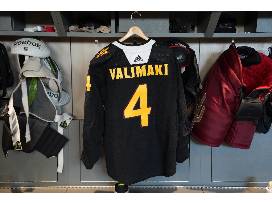 Pre-game worn ASU Night jersey in size 56. This jersey was worn during warmups of the Coyotes vs. Sharks game on April 1st, 2023 and autographed by #4 Juuso Valimaki.