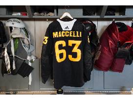 Pre-game worn ASU Night jersey in size 56. This jersey was worn during warmups of the Coyotes vs. Sharks game on April 1st, 2023 and autographed by #36 Matias Maccelli.