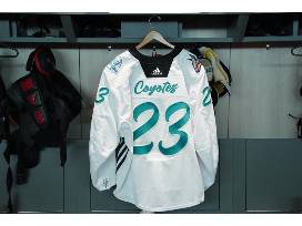 Los Yotes Warmup jersey in size 56. This jersey was issued during warmups of the Coyotes vs. Kraken game on April 10th, 2023 and autographed by 2022-23 Coyotes Team.