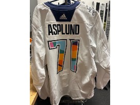 Pride jersey autographed by #71 Rasmus Asplund. (fight strap included). Worn during pre-game skate April 4. SIZE 56.